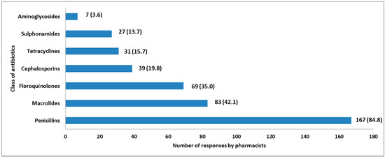 Penicillins 167 (84.5%) were the most dispensed class of antibiotics without a prescription, followed by macrolides 83 (42.1%) and fluoroquinolones 69 (35.0%) (Figure 4).