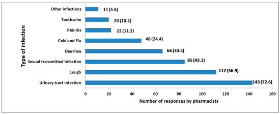 Pharmacists mentioned some infections to which antibiotics are usually dispensed without a prescription. The leading conditions were urinary tract infection 143 (72.6%), cough 112 (56.9%) and sexually transmitted diseases 85 (43.1%) (Figure 5).
