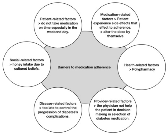 Nonadherence is defined as the patients’ noncompliance with healthcare providers’ instructions or recommendations regarding their treatment plans, including medication use or lifestyle changes, ultimately affecting the outcomes [9,10]. According to the World Health Organization, the rate of adherence to chronic disease therapies in developed countries is about 50%, and this rate is even lower in developing countries. The low adherence rate represents our need to identify medication adherence barriers in diabetes patients [11].