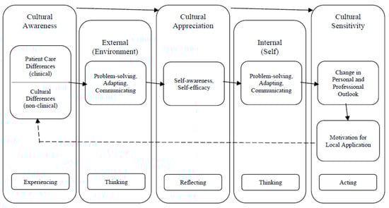 The Papadopoulos, Tilki and Taylor Model for Developing Cultural Competence was originally developed to address cultural learning in nursing students []. It includes four stages: awareness, knowledge, sensitivity, and competence. The GHELP model does not include knowledge as a stage but instead focuses on students’ experiencing, thinking, reflecting, and acting as part of the progression. While there is some overlap in the terminology used to describe the stages of development within each model, the two models do not directly align.