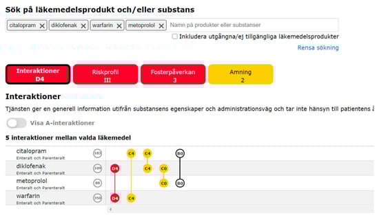 Janusmed is a collection of databases for safe drug treatment []. Janusmed interactions (formerly known as Sfinx) is a DDI database aimed at healthcare professionals (HCP), which has been available in Sweden since 2007 []. The database is used to check for pharmacokinetic DDI and provides information on potential consequences and a recommendation for HCP on how to handle the interaction. Janusmed interaction may be embedded in electronic health records (EHR) as one component in clinical decision support systems (CDSS) but is also available online to everyone who registers as a user []. The Janusmed interaction database contains information about DDI between active substances in drug products available on the Swedish market. Although DDI (including herbal remedies) is the core of the database, some drug-alcohol and drug-food interactions are also presented. The database covers clinically relevant pharmacokinetic interactions. The interactions are classified as A–D, showing the interactions’ relevance together with a number 0–4 indicating the interactions’ grade of documentation, see example in Figure 1. Some pharmacodynamic interactions are included because of high clinical relevance, but pharmacodynamic interactions are mainly covered in the knowledge database Janusmed riskprofile (formerly known as PHARAO), which is complementary to Janusmed interactions but available to HCP exclusively []. The Janusmed collection also includes knowledge databases on drugs and lactation, teratogen effects, renal function, sex and gender [,,]. In the online version of Janusmed interactions, the user logs in and enters two or more drugs in order to then receive a graphic presentation of potential DDI, if there are any [].
