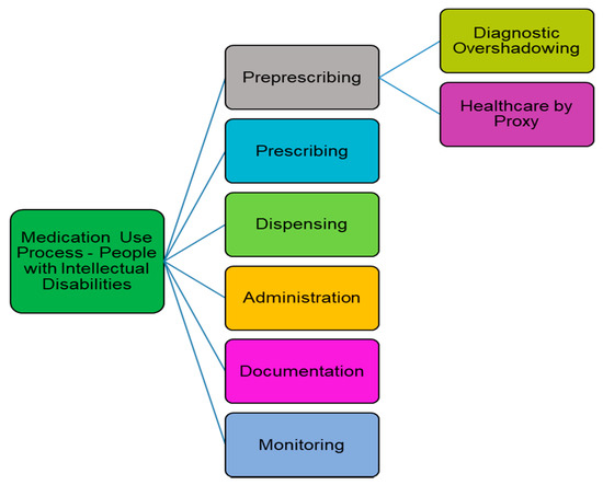 Several steps have been identified in the medication use process: prescribing, dispensing, administration, documentation and monitoring. The process as experienced by the population with intellectual disabilities includes a significant ‘pre prescribing’ step consisting of two important elements: recognition/assessment and diagnosis/cause identification, as shown in Figure 1. These are vital components of the medication use process experienced by this population with communication difficulties, in which ‘diagnostic overshadowing’ [38,39], and ‘healthcare by proxy’ [40], are significant factors. Both factors will introduce risk to the quality of the medication use process.