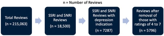 This study was a retrospective analysis of the Drugs.com® dataset from the University of California Irvine Machine Learning Repository [8,9]. The dataset contained 215,063 unsolicited drug reviews pulled from Drugs.com®. This dataset was created by crawling Drugs.com®, to gather all the reviews and associated data. This study used a subset of 5796 reviews. The dataset contained the following variables: ID, drug name, condition, review, rating, date, and useful count. ID identified each review. Drug name was a nominal variable designating the medication. Condition denoted the condition that was being treated. The review was a free-text review of the medication. The rating was a value between 1 and 10 of the therapy’s effectiveness. All reviews related to a Selective Serotonin Reuptake Inhibitor (SSRI) or Serotonin–Norepinephrine Reuptake Inhibitor (SNRI) were included, which narrowed the number of reviews to 18,500. Drug names were first linked to a class (SSRI or SNRI), using a string match between the data frame containing the drug name and class and the data frame with the reviews. The following SSRIs were included: sertraline, citalopram, escitalopram, fluoxetine, fluvoxamine, and paroxetine. The following SNRIs were included: venlafaxine, desvenlafaxine, duloxetine, milnacipran, and levomilnacipran. Figure 1 shows a summary of data filtering.