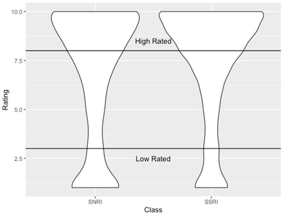 This figure shows a violin plot showing the distribution and grouping of ratings between the classes. For SSRIs, 2418 reviews fell into the high-rated group, and 621 reviews fell in the low-rated group. For SNRIs, 1946 reviews fell into the high-rated group, and 811 reviews fell in the low-rated group. Most reviews fell in the high-rated section, with the fewest reviews occurring in the middle of the ratings.