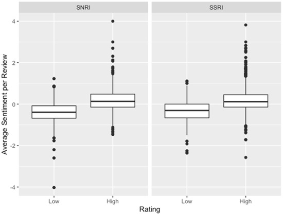 This figure shows the distribution of average sentiment between classes and ratings. High-rated reviews had higher sentiment on average. High-rated SSRI reviews had an average sentiment of 0.164, compared to 0.175 for high-rated SNRI reviews. Low-rated SSRI reviews had an average sentiment of −0.320, compared to −0.403 for low-rated SNRI reviews.
