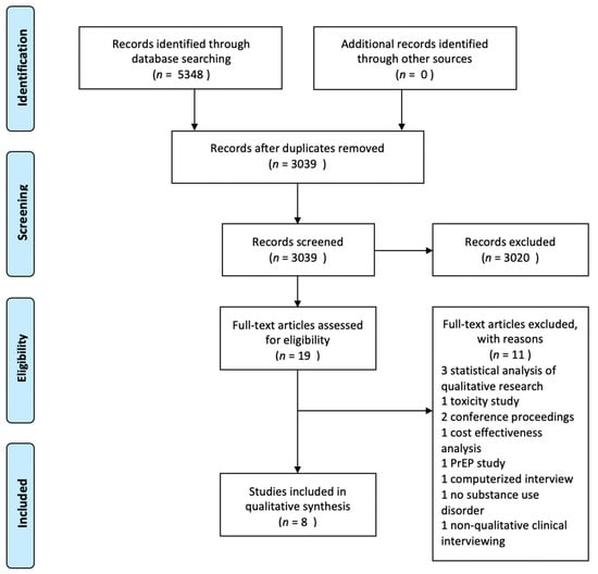 The systematic literature search was performed in December 2019. Four databases were searched: PubMed/MEDLINE, Scopus, Web of Science, and Cumulative Index to Nursing & Allied Health Literature (CINAHL). Search strategies were created by the pharmacy librarian (Appendix). A total of 5348 results were exported from databases into EndNote x9, and duplicates were removed for a total of 3039 unique abstracts to screen. The unique records were imported into Rayyan (URL https://rayyan.qcri.org/, accessed on 15 December 2019), an online platform designed to expedite the screening process. Three authors screened titles and abstracts and determined that nineteen articles would be screened in full text. On 9 April 2020, it was determined that eight articles would be included for review (Figure 1).