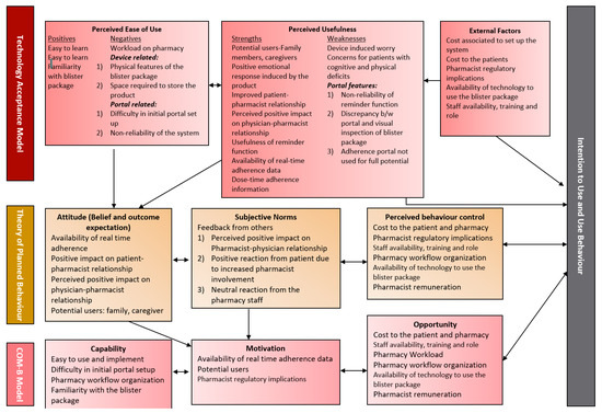 Three validated frameworks were used to inform this research: (1) the Technology Acceptance Model (TAM), (2) Theory of Planned Behaviour (TPB), and (3) Capability, Opportunity, Motivation, Behaviour (COM-B) Model. It has been argued that TAM alone cannot predict healthcare providers’ beliefs about the use of health-related technology [29], therefore, we used an integrated approach of combing two behaviour theories—TPB and COM-B Model with TAM framework—to explore the factors affecting the implementation of technology-based adherence intervention in a community pharmacy setting, and to add rigour to the study.