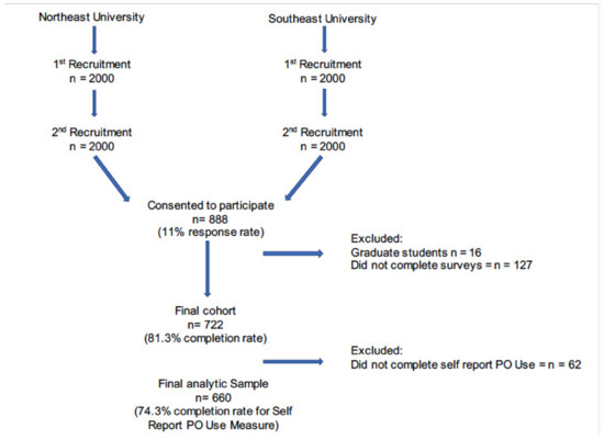 Undergraduate students were recruited from two universities located in the United States. Recruitment of participants occurred during the spring 2018 semester. The study was reviewed and approved by the two universities’ Institutional Review Boards. The registrar’s office generated a random sample of students (n = 2000) at each university, with a target enrollment of 500 students per school (for a total n = 1000). Students were contacted via email and invited to participate in the study. No directly identifiable information was gathered from participants; however, given the nature of the study, a certificate of confidentiality was attained to protect participant data. Enrollment was ongoing throughout the semester, and a second wave of recruitment occurred during the semester, including an additional randomly selected sample (n = 2000) from each university (see Figure 1).