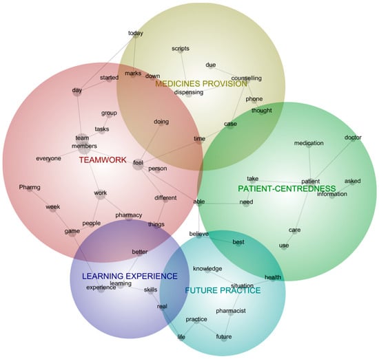 The heat mapping of the concept map reveals themes in descending order of importance where importance is determined by semantic frequency and co-occurrence of words and concepts in the concept map. Warmer colors (red, orange) indicate the most relevant concepts, whereas cooler colors (blue, green) denote the least relevant [30]. Leximancer defines relevance as the number of occurrences of the concept as a proportion of the most frequently occurring concept. The most important theme identified was teamwork (red), with component concepts related to daily collaborations. The theme of medicines provision (yellow) identified students’ focus on case work, including dispensing and counselling, whereas patient-centeredness (green) was about providing care and information to the patient. Future practice (blue-green) identified students’ translation of the experiential learning to their future practice and development of real-life skills and the theme of learning experience (purple) covered concepts about the learning experience and application of real-life skills. The main concepts identified in semantic analysis are recorded by theme in Table 2.
