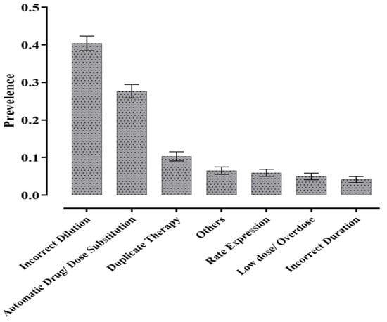 The study sample encompassed 2405 interventions documented by 52 different pharmacists during the study period. The most commonly identifiable type of intervention was incorrect dilution (n = 972, 40.2%) followed by dose substitution and duplicate therapy (n = 665, 27.7%), and (n = 248, 10.3%) respectively (Figure 1).