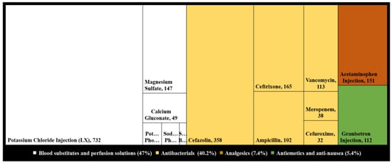 Moreover, the drug category associated with a high percentage of interventions based on ATC classification was blood substitutes and perfusion solutions (n = 981, 41%), followed by antibacterial for systemic use and analgesics (n = 839, 35%), and (n = 154, 6.4%), respectively. The main therapeutic subgroups frequently reported within blood substitutes and perfusion solutions were electrolyte solutions; potassium chloride 74.6%, magnesium sulfate 15% and calcium gluconate 5%. Also, cefazolin, ceftriaxone and vancomycin were responsible for 40%, 20%, and 15%, respectively, of the total interventions in the antibacterial category, as shown in (Figure 2).