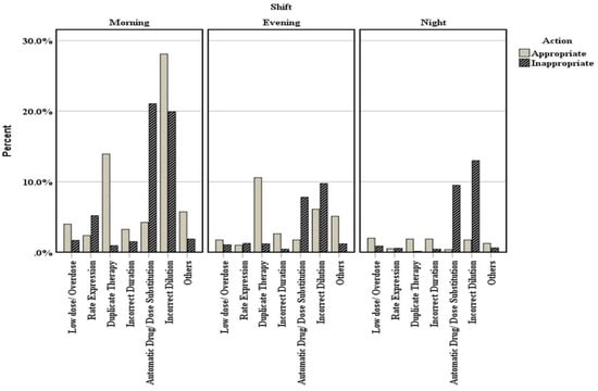 Among 2405 documented interventions, (1600 (66.5%)) interventions were documented inappropriately while the appropriate documented interventions were (804 (33.4%)). Moreover, 52% of the inappropriate interventions were reported in the morning duty. Also, the documented interventions during evening and night duty were lower than that of the morning duty (23% and 25%, respectively (Figure 3)). Furthermore, out of 804 appropriate interventions, 289 (36%) come from incorrect dilution, while the duplicate therapy represented 26% of the total interventions. On the contrary, most inappropriate interventions were documented within the incorrect dilution category (n = 683, 43%). Furthermore, there was an increase in the odds of appropriate documentation among pharmacists working in the morning and evening duty compared with night duty (OR = 3.095, 95% CI = 2.36–4.04), (OR = 3.33, 95% CI = 2.48–4.4), respectively.