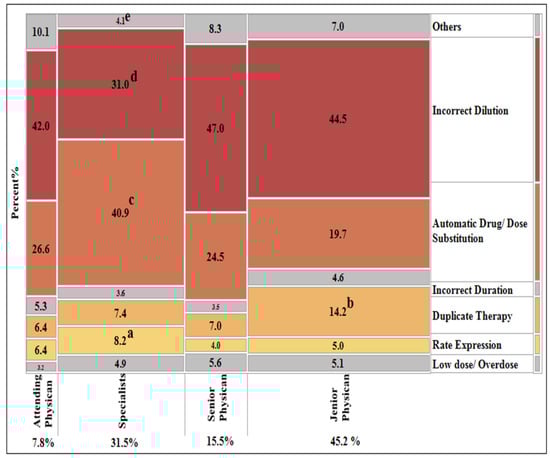 Mosaic plot representing the distribution of pharmacist interventions for prescribing errors depending on the prescribers’ level. a p < 0.05 compared with junior physician; b–d p < 0.05 compared with all other prescribers’ level; e p < 0.05 compared with senior and attending physician; by post hoc Chi-square tests (Bonferroni adjustment p-value = 0.00357).