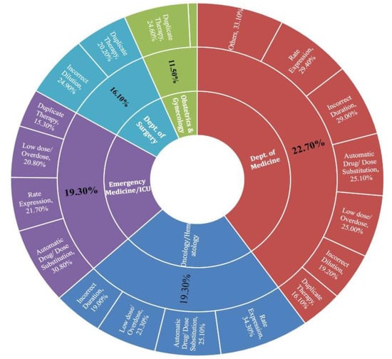 Analysis of prescribing errors rate in various specialties showed that the highest present of error in all types of errors was entered by internal medicine physicians, which represent 22.7%, followed by oncology and ER physicians, which displayed an equal number of errors rate of 19.3%. Of the reported rate expression interventions, 34.3% were entered by oncology physicians and 29.4% by internal medicine physicians. On the other hand, 24.6% of the duplicate orders that required interventions were prescribed by Obstetrics and Gynecology. Besides that, a large number of reported interventions due to dilutional errors (24.9%) were requested by surgical doctors (Figure 5).