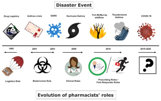 - Watson, K.E.; Van Haaften, D.; Horon, K.; Tsuyuki, R.T. The evolution of pharmacists’ roles in disasters, from logistics to assessing and prescribing. Can. Pharm. J. (Ott.) 2020, 153, 129–131. [Google Scholar] [CrossRef] [PubMed]
