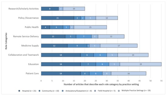 Comparison of roles performed by frontline pharmacists during COVID-19 in the hospital, community, and across multiple practice settings (n = number of articles).