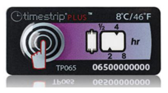 Timestrip® Plus temperature indicator (available from https://timestrip.com/ accessed on 17 July 2021).