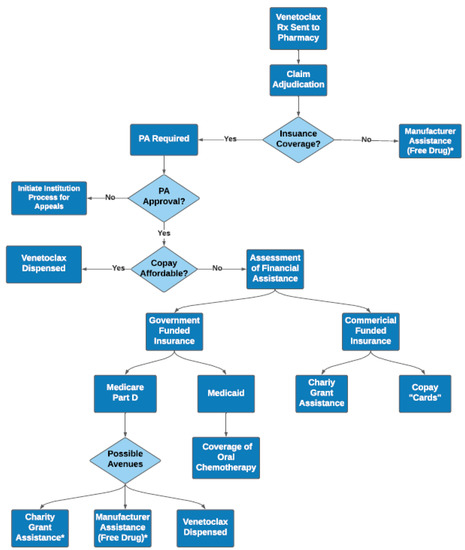 Complexities Surrounding Venetoclax Access in Clinical Practice. After venetoclax is sent to the pharmacy of choice, various pathways are available to help obtain medication and limit patient financial toxicity. Based on insurance status, copay affordability, income status, and other factors, patients may be eligible for copay cards, manufacturer assistance, charity grant, or other avenues for financial help. Rx = prescription; PA = prior authorization; * If patient meets income eligibility requirements for assistance.