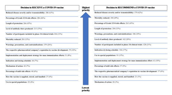 Regardless of the pharmacists’ decision to receive or recommend vaccination, all respondents were asked to prioritize the top three clinical pieces of clinical information they would prioritize when formulating a decision to receive or recommend a COVID-19 vaccine. The prioritization of this clinical information is shown in Figure 1.