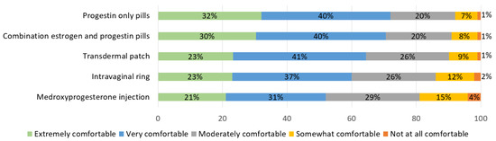 Of the 296 students who had previously received HC education, 62% reported that their pharmacy curricula left them “moderately educated”, “well educated”, or “extremely well educated” to provide the clinical skills needed to for pharmacist-prescribed HC. However, 35% of students were “not at all familiar” or “somewhat familiar” with the US Centers for Disease Control and Prevention: Medical Eligibility Criteria for Contraceptive Use (USMEC). Figure 1 depicts the student-reported knowledge and comfort level with prescribing specific methods of HC. Students were most comfortable with oral contraceptive pills, with 71% and 72% reporting that they were “very comfortable” or “extremely comfortable” with combination estrogen and progestin and progestin only pills, respectively. Students were least comfortable with prescribing medroxyprogesterone injection, with 52% of students reporting that they were “very comfortable” or “extremely comfortable” with this method.