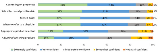 Student pharmacists’ confidence level in providing services related to prescribing HC is shown in Figure 2. Pharmacy students who received HC education were most confident with counseling on proper use of HC, with 85% reporting they felt “very confident” or “extremely confident”. However, only 44% of students reported being “very confident” or “extremely confident” regarding adjusting and/or switching HC products.
