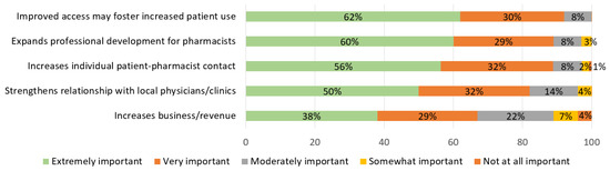 Pharmacy students ranked the importance of perceived benefits of pharmacist-prescribed HC. See Figure 3. Participants most often reported it is “very important” or “extremely important” to improve access that may foster increased patient use (91%), expand professional development for pharmacists (89%), and increase individual patient–pharmacist contact (89%). Further, 10.8% of students reported that increasing business/revenue was “somewhat important” or “not important”.