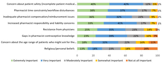 Participants were also asked to rank the importance of perceived barriers to pharmacist-prescribed HC. See Figure 4. Perceived barriers most commonly ranked either “very” or “extremely important” were concern about patient safety (82%), pharmacist time constraints/workflow disturbances (75%), and increased pharmacist responsibility and liability concerns (75%). Almost half of students (46%) reported that religious/personal beliefs were somewhat important or not important at all.