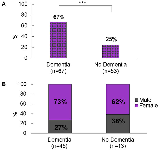 (A) prevalence of APM prescribing in people with and without dementia, *** p < 0.001. (B) breakdown by gender of APM prescribing in people with and without dementia.