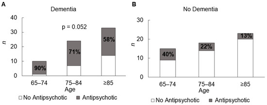 The key findings from this study are that 48% of nursing home residents in six Cork nursing homes are prescribed APMs. Significantly, this study also demonstrated that patients with dementia are more likely to be prescribed one of these agents compared to those without dementia (67% vs. 25%). Comparing the findings of this study with those reported in the literature, it appears that the prescribing rates of APMs in this sample is at the higher end of the scale, with prevalences ranges from as low as 12% to as high as 64% [36,37]. This study found a trend towards a greater prevalence of APM use in younger people with dementia, in line with similar European studies [14,16,17].