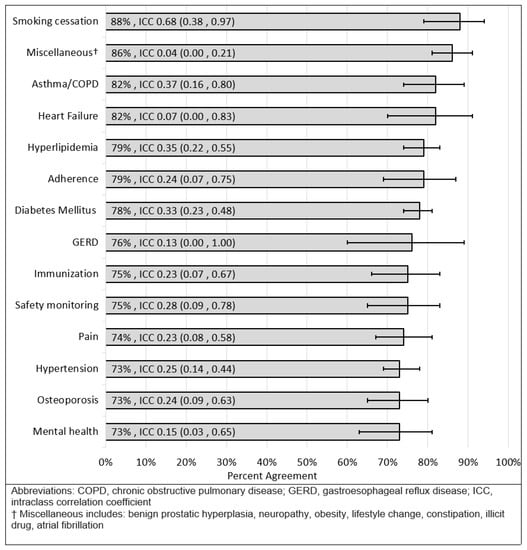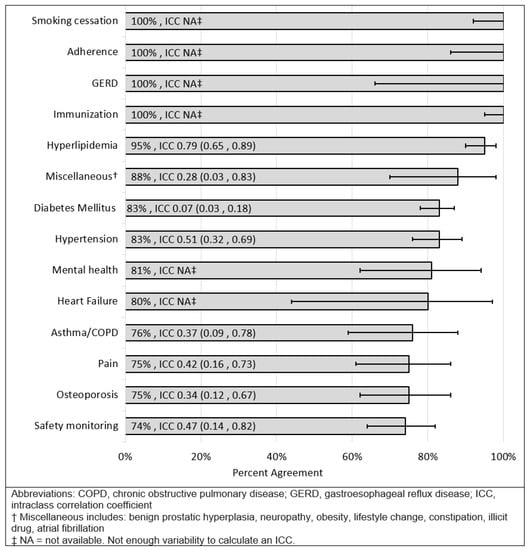 Agreement and 95% confidence interval of MTP Pharmacy Quality Alliance (PQA) categorization by disease state.