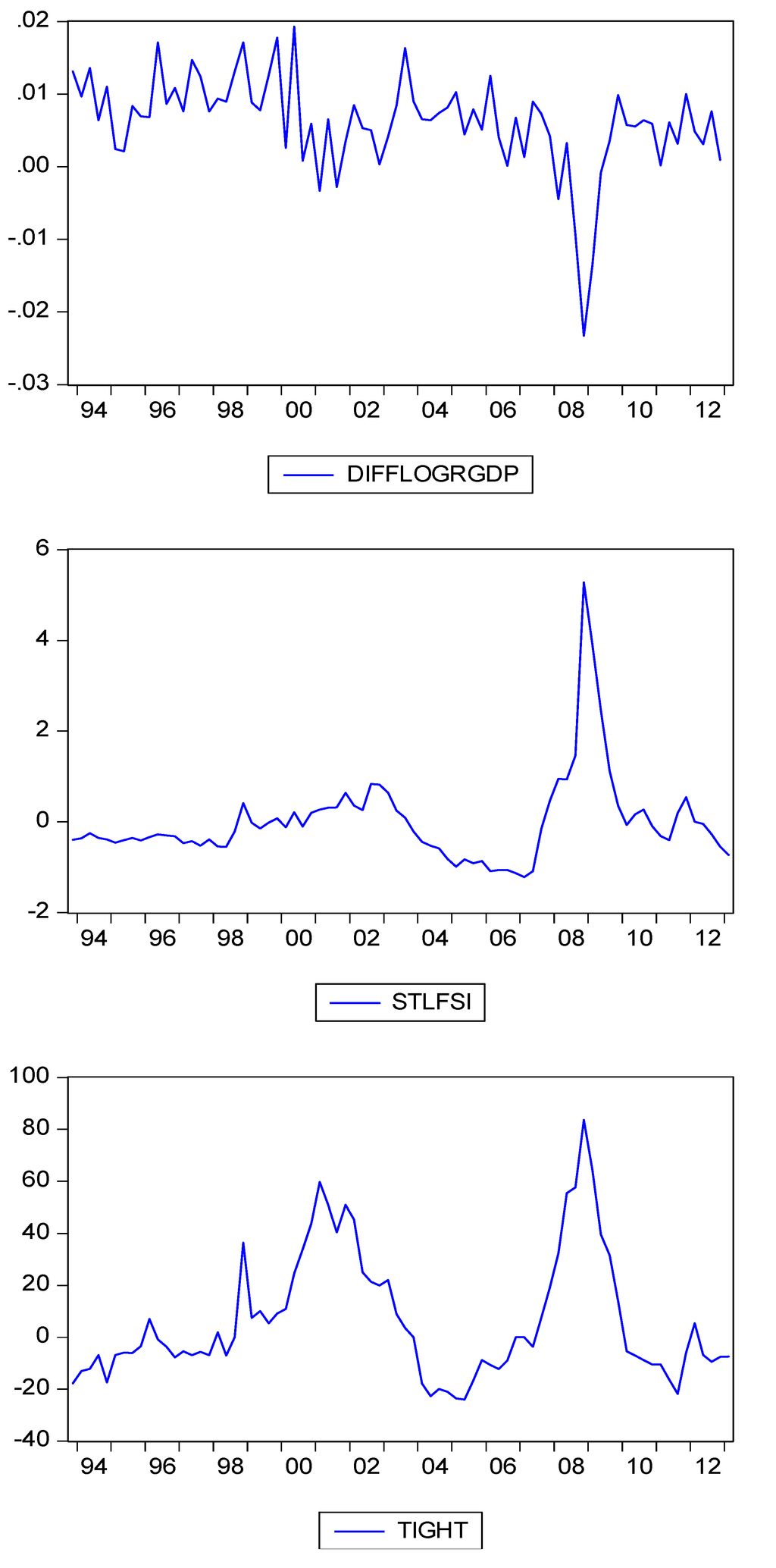 Time series graphs of the endogenous variables over the sample 1993Q4-2013Q1. DIFFLOGRGDP is the log difference of real GDP for the U.S. STLFSI is the St. Louis Fed stress indicator, and TIGHT is the percentage of loans officer reporting a tightening of standards.