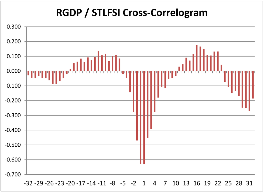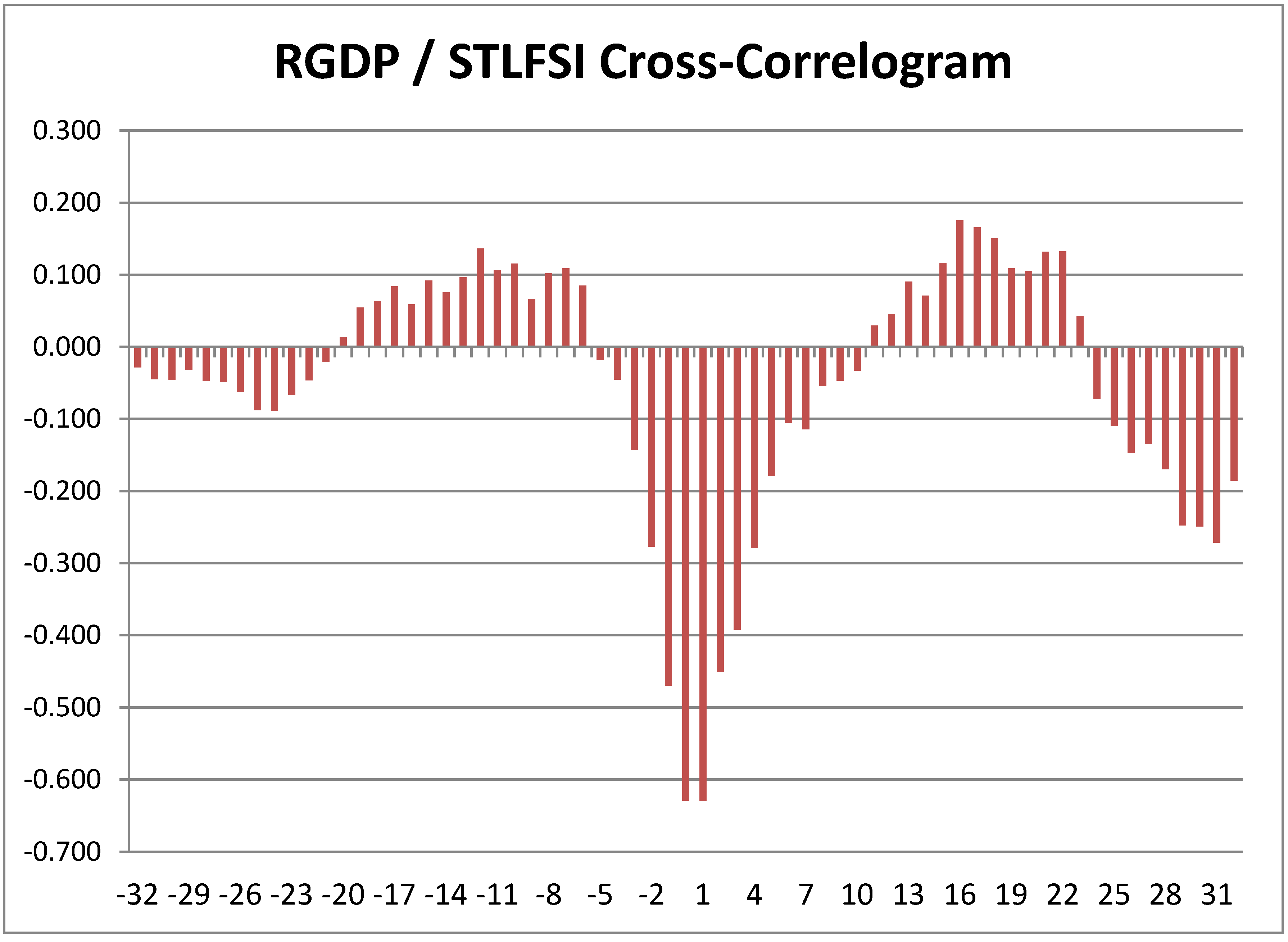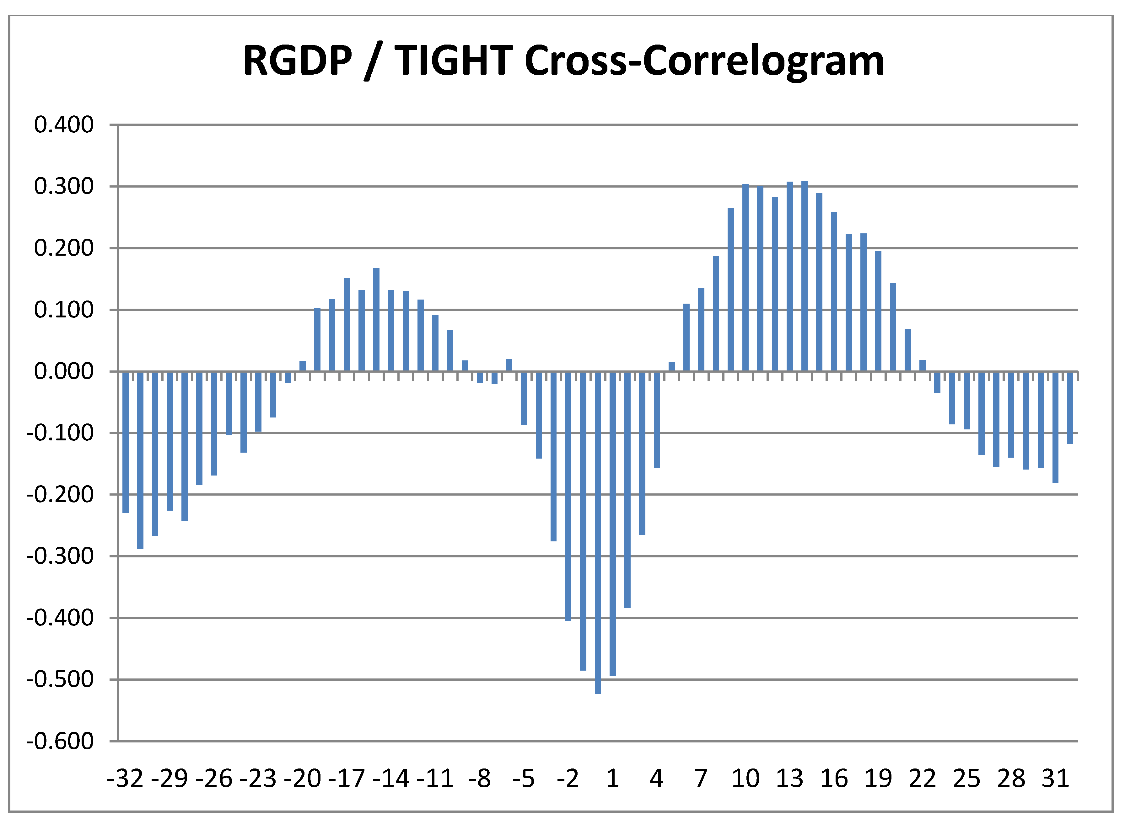 Preliminary examination of the cross-correlograms in Figure 2, Figure 3, Figure 4 show anticipated relationships between the three variables. There is a negative contemporaneous relationship between log differenced real GDP and the two measures of credit market conditions and a positive contemporaneous relationship between STLFSI and TIGHT. However, the cross-correlograms also show a great deal of persistence, so any conclusions about causality require formal testing.