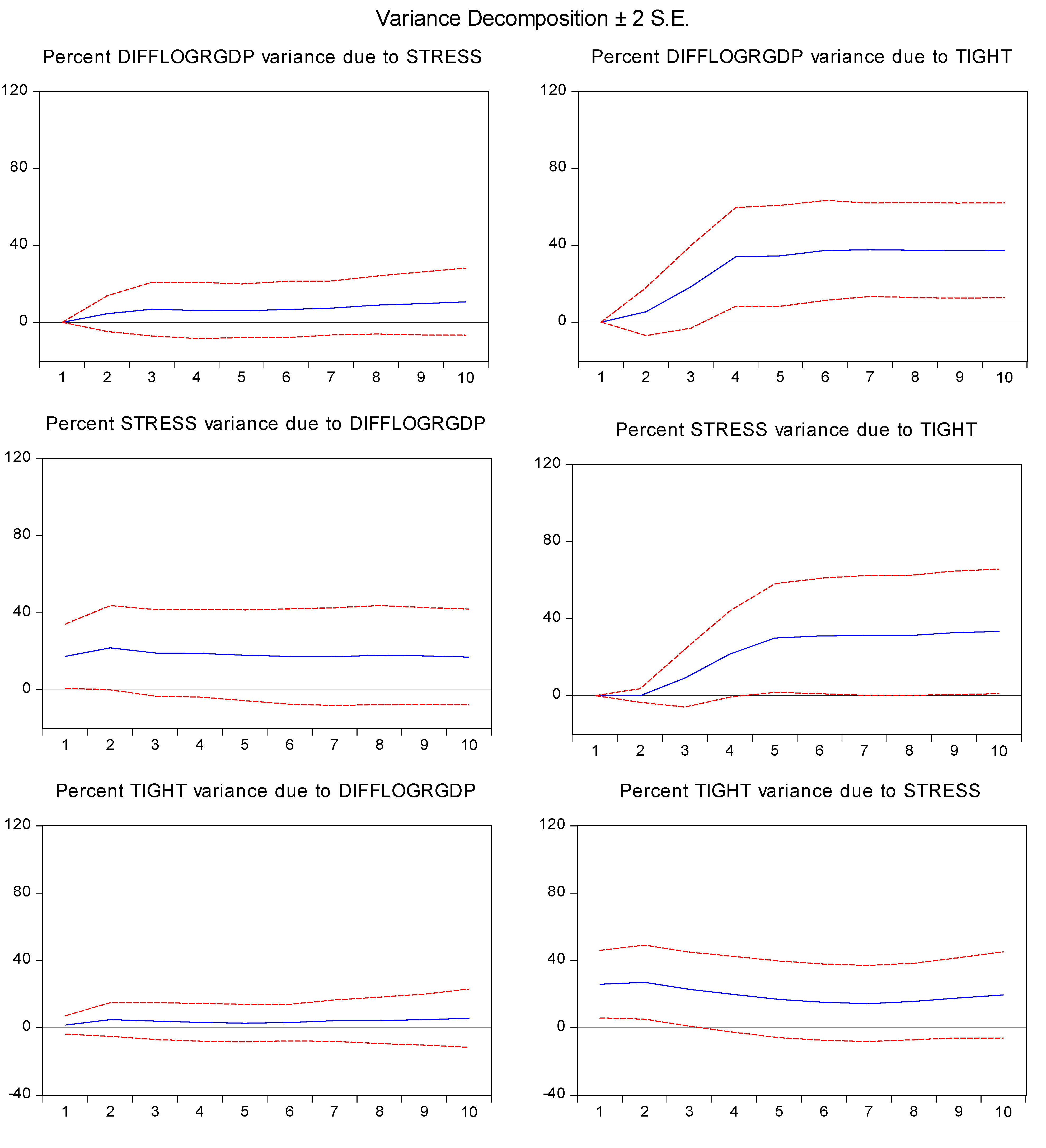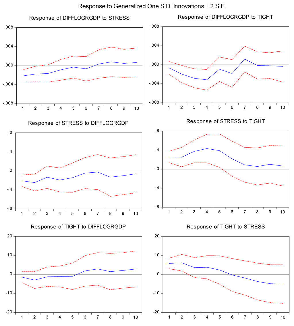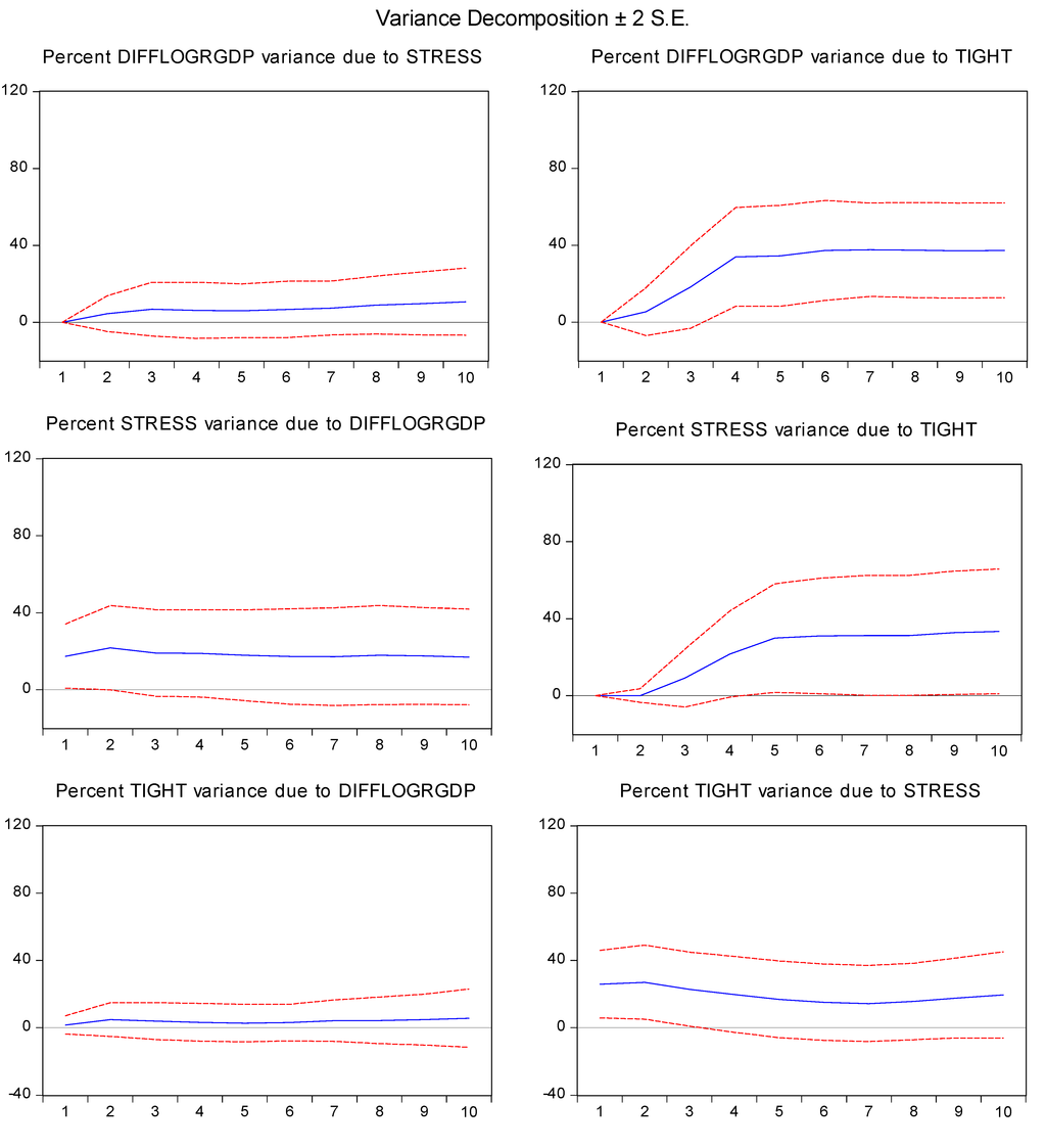 Graphs of the impulse response functions and variance decomposition in Figure 5, Figure 6 show that there is an intuitive relationship between the three variables. Real GDP declines with an increase in the financial markets stress indicator and a tightening of lending standards. STLFSI and TIGHT are positively correlated as expected. The variance decomposition graphs confirm that the loan officer survey data on standards has greater explanatory power for both real GDP and the stress indicator.