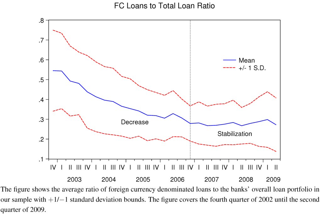 Increased loan default risk as a consequence of foreign currency lending or increased loan loss provisioning and thus lower profitability in the banking system are reasons alone for us to evaluate the dollarization process in emerging market economies. Afterall, we know how common banking crises are in emerging market economies. Moreover recent history has shown us that financial difficulties arising in the banking sector can lead to a general recession or might have spillover effects in non-financial sectors as well (see Setser et al. [14]). The actions taken by governments in these countries can result in regulators’ risk mitigation efforts in their banking systems. Therefore studying the development of foreign currency lending in Turkey in the period prior to the regulatory change can give us some ideas about regulatory behavior and risk in other emerging market economies. The fact that other emerging market economies (i.e., Korea) restricted their FC lending also suggests that the findings of this paper may have implications beyond the scope of one country.