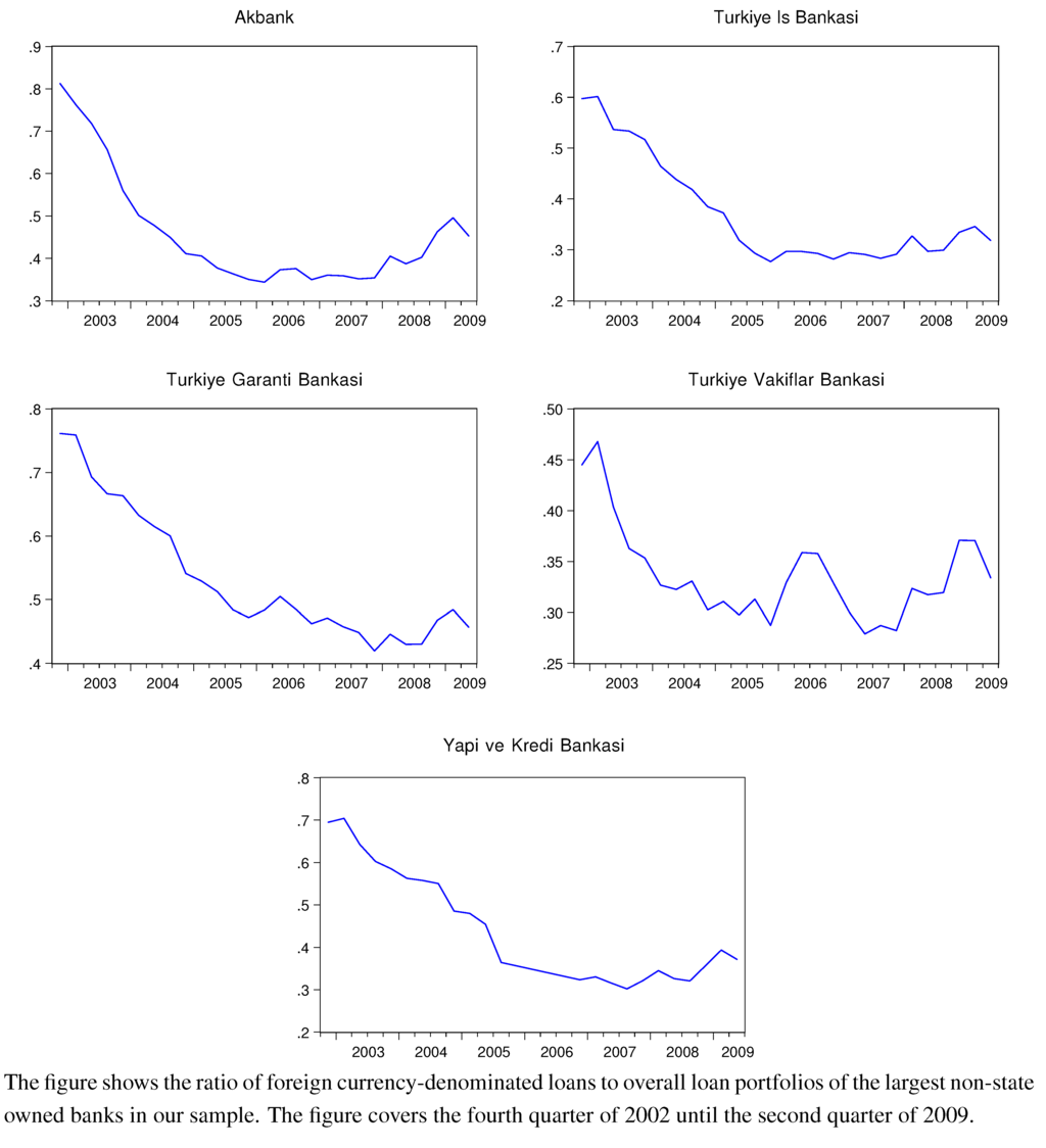 Figure 2 presents the foreign currency loan ratios for the the five largest (in terms of assets) non-state owned banks in our sample as of the second quarter of 2009, which is the last quarter before the regulators banned foreign currency lending to households (as of 2009, these five banks represented over 56% of all assets in the Turkish banking system.) As the figure makes it perfectly clear, all non-state owned banks at the end of the sample period have had foreign currency denominated loans close to 28% of their total loan portfolios. Such heavy exposure to foreign currency lending must have obviously been a cause for concern to regulators and may shed light on the reasons behind the policy change.