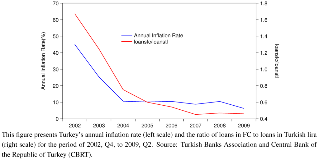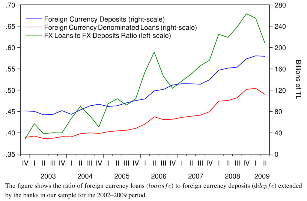 In the case of Turkey, during our analysis period, we see that there is a high correlation between inflation and the ratio of foreign currency loans to local currency loans. The Turkish banking system simply converts foreign currency deposits into foreign currency loans, as we find out. The absence of hedging as a result of such practice makes the Turkish banking system vulnerable to sudden and drastic exchange rate fluctuations. We know from history that global economic crises lead to the outflow of capital from emerging market economies like Turkey and can result in large and sudden depreciation of local currency. Considering the fact that by 2009, more than a quarter of all loans in the Turkish banking system were in the form of foreign currency and for every 10 TL worth of foreign currency deposit in the system, there is 7 TL worth of FC loans, we can understand the severity of the risk posed. The timing of the 2009 decision is appropriate given the increase in the foreign currency loans vis-Ã -vis foreign currency deposits in the banking system. We believe the regulators in Turkey made the policy change as a preventive measure against possible future financial distress, which might have undesirable social implications. By only concentrating on household loans as opposed to business loans, the regulators also aimed at protecting the group of borrowers who are more prone to financial losses.