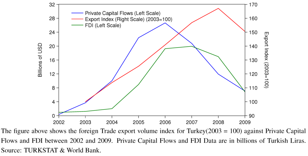 Although Turkey suffered from the Global Financial Crisis and its impact on falling demand from its traditional markets such as Europe, manufacturing grew at an average rate of 4.7% between 2002 and 2009. The gross capital formation during the same time frame grew at an average 7.6% despite the Global Financial Crisis. Although the unemployment rate has hovered around 10%–11% and the labor force participation rate has not changed significantly (around 49%) during our study period, Turkey has achieved a phenomenal growth in its income levels. The GNI per capita has increased from $3460 in 2002 to over $9000 in 2009, while the percentage of population earning less than $2/day has decreased by half from 9.57% in 2002 to 4.16% in 2009. Table 1 provides additional economic indicators for Turkey.