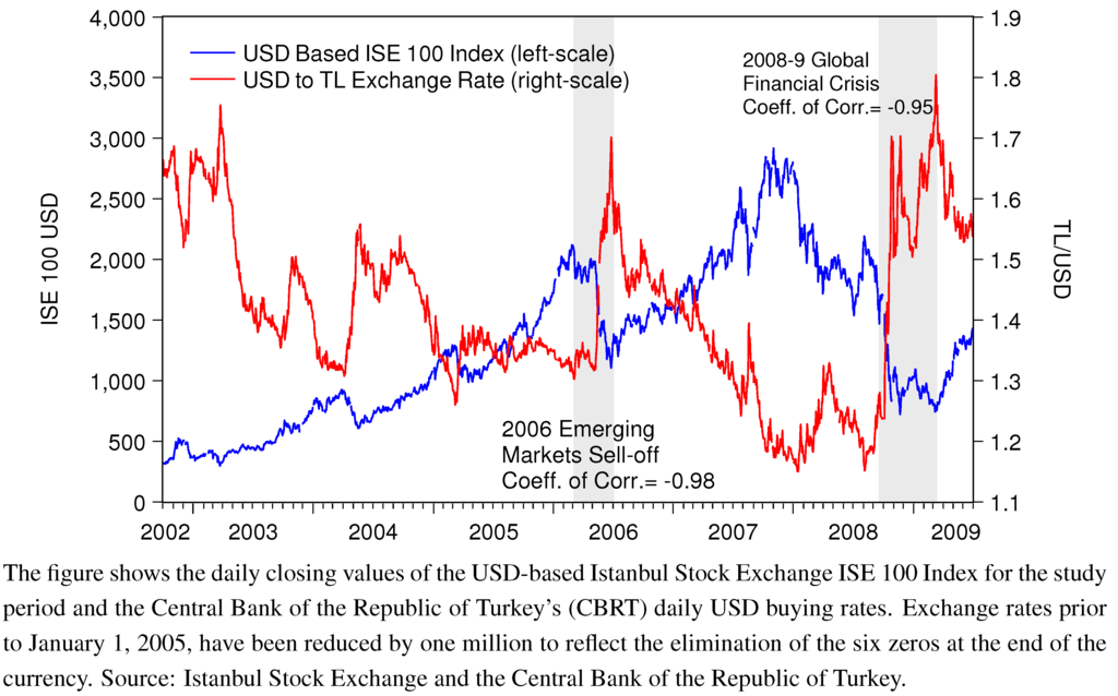 The stock market also gives us an idea about the general economic performance and investor sentiment. Figure 8 shows the USD-based Istanbul Stock Exchange (ISE) 100 index during the study period. The market lost almost half of its value in 2008 as a result of the Global Financial Crisis; the index dropped from $2,789 at the end of 2007 to $1,027 at the end of 2008. The subsequent rise in the dollar-lira exchange rate can be seen in the same figure. The correlation between the returns on the stock market and the FX rate during the sample period is −0.71. This suggests that the foreign currency exchange rate is highly correlated by stock market movements. The results of the pairwise Granger Causality Tests also confirm our findings. As shown in Table 2 while lira-dollar exchange rate movements do not Granger-cause ISE100 Index changes, the ISE100 level Granger causes the lira-dollar exchange rate. For example, the lira-dollar exchange rate jumped from 1.2 liras to a dollar to 1.7 when the ISE index dropped from $2,789 at the end of 2007 to $1,027 at the end of 2008. The coefficient of correlation between the two variables is even higher during these crisis periods; during the 2006 emerging markets sell-off, we observed a correlation coefficient of −0.98 between March and June of 2006; while in 2008, the same value is −0.95 between 15 September 2008 (the Lehman Brothers Bankruptcy), and March 10, 2009 (the date considered to be the end of the bear market on Wall Street, when both Citibank and Bank of America announced positive earnings).