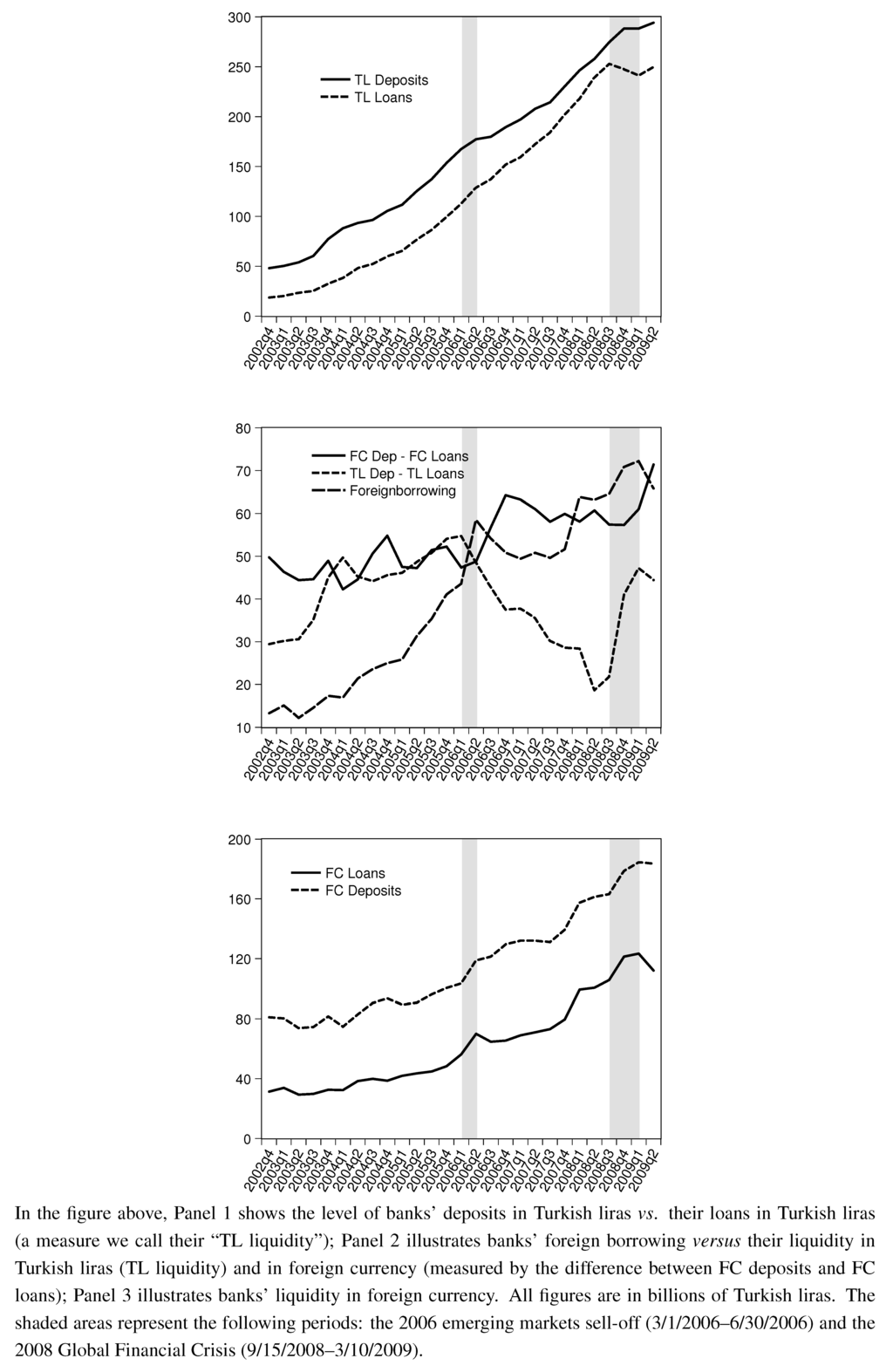 In the second panel of the same Figure, we show banks’ liquidity positions (measured by the difference between deposits and loans) in foreign currency and in Turkish liras against their foreign borrowing. As can be seen, after 2006, TL liquidity falls significantly, and the amount of borrowing from foreign banks increases. However, liquidity in foreign currency increases during the same period.