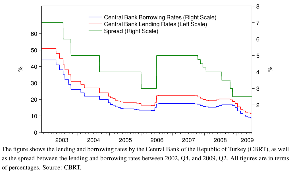 In conjunction with the ITregime, the Turkish Central Bank consistently lowered the levels and the spread between the overnight borrowing and lending rates during the 2002 and 2009 period. At the end of 2002, the Central Bank’s benchmark borrowing (lending) rate was 44% (51%), and by the end of 2008, the same rates were 15% (17.5%), which implies that the spread decreased from 7% to 2.5% (a 64% decrease). This dynamic shows the commitment of the Turkish monetary authorities to provide the liquidity that was required by its growing economy and their mandate to keep the inflation target in line. Figure 11 illustrates the rate changes.