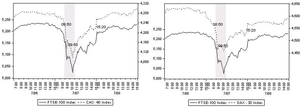 Within this particular thematic focus of this strand of literature, this paper addresses the cross-market transmission of the shock generated by a major European terrorist event. The study focuses on the 7 July 2005 London bomb attacks that, along with the 2004 Madrid bombings, are considered to be the European equivalent of 9/11 albeit on a much smaller scale in terms of the number of victims and destruction to property and infrastructure (Kollias et al. []). However, unlike previous studies those rely on daily data to assess the impact of terrorist events on financial markets as well as their contagion effect, this study uses high frequency data to investigate the issue at hand. By opening a window on high frequency data, investors may discover profit opportunities not easily detected in daily data. In total, each series of 10-minute interval frequency contains over 10,000 observations. As it has been argued and shown, intraday data help reveal a more accurate picture of how markets and market agents react and adapt to changes and exogenous shocks (inter alia: Connolly and Wang []; Hanousek []; Égert, and Kočenda []; Markelos et al. [].). Consequently, the more detailed account and the information contained in high frequency data allow more reliable inferences and conclusions to be drawn vis-à-vis daily data.
