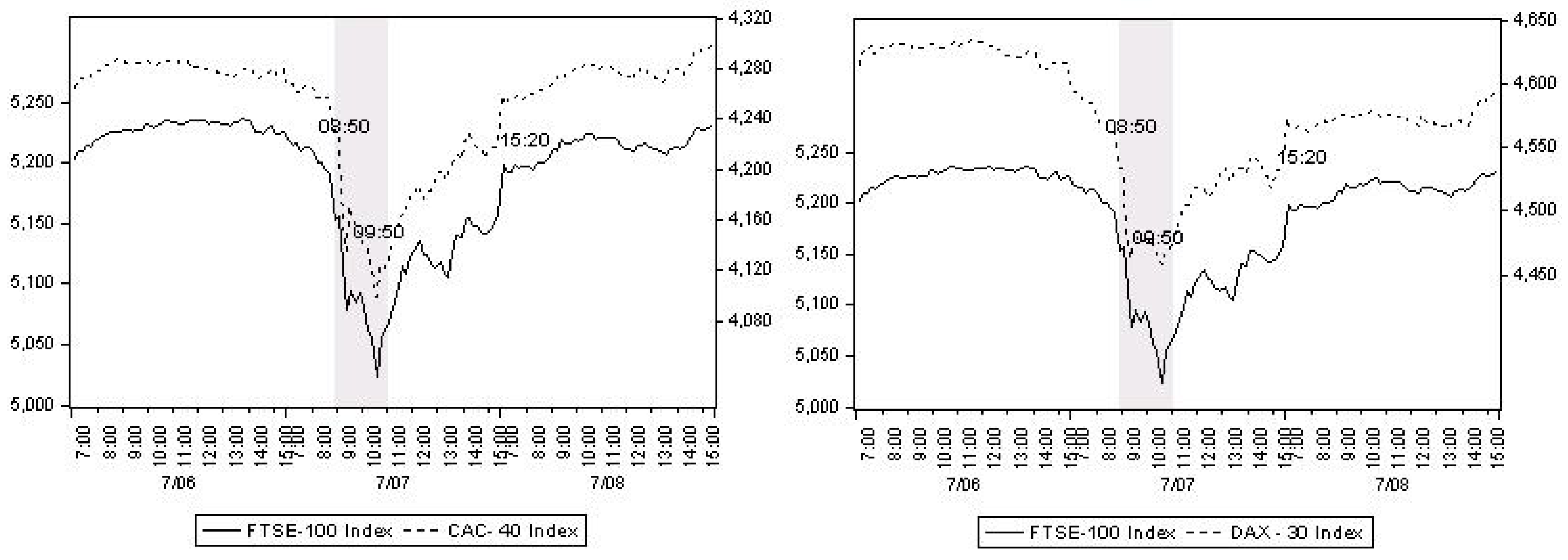 Within this particular thematic focus of this strand of literature, this paper addresses the cross-market transmission of the shock generated by a major European terrorist event. The study focuses on the 7 July 2005 London bomb attacks that, along with the 2004 Madrid bombings, are considered to be the European equivalent of 9/11 albeit on a much smaller scale in terms of the number of victims and destruction to property and infrastructure (Kollias et al. [26]). However, unlike previous studies those rely on daily data to assess the impact of terrorist events on financial markets as well as their contagion effect, this study uses high frequency data to investigate the issue at hand. By opening a window on high frequency data, investors may discover profit opportunities not easily detected in daily data. In total, each series of 10-minute interval frequency contains over 10,000 observations. As it has been argued and shown, intraday data help reveal a more accurate picture of how markets and market agents react and adapt to changes and exogenous shocks (inter alia: Connolly and Wang [33]; Hanousek [34]; Égert, and Kočenda [35]; Markelos et al. [36].). Consequently, the more detailed account and the information contained in high frequency data allow more reliable inferences and conclusions to be drawn vis-à-vis daily data.