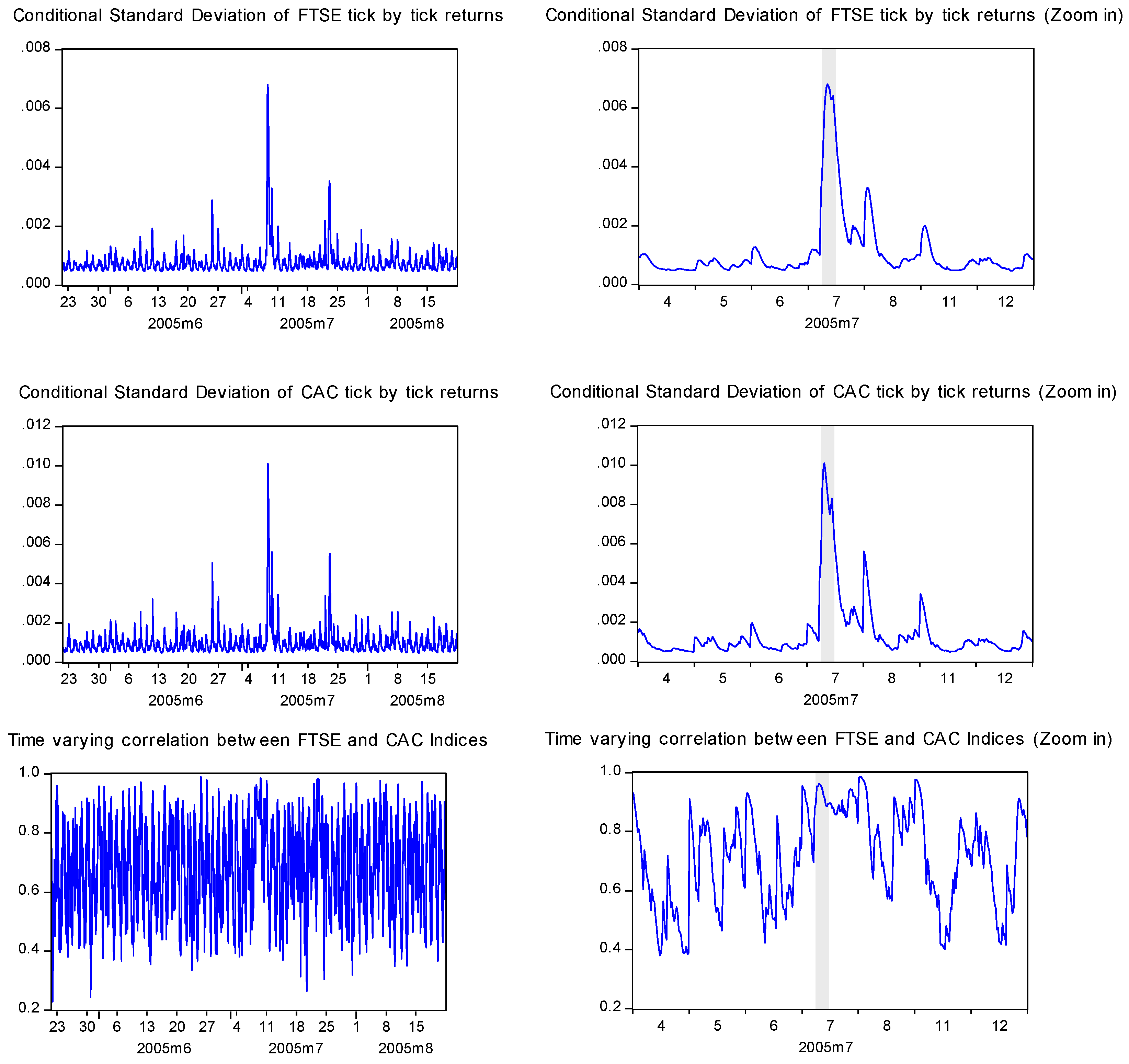 Conditional Volatilities and Correlation for FTSE-CAC intraday stock returns.