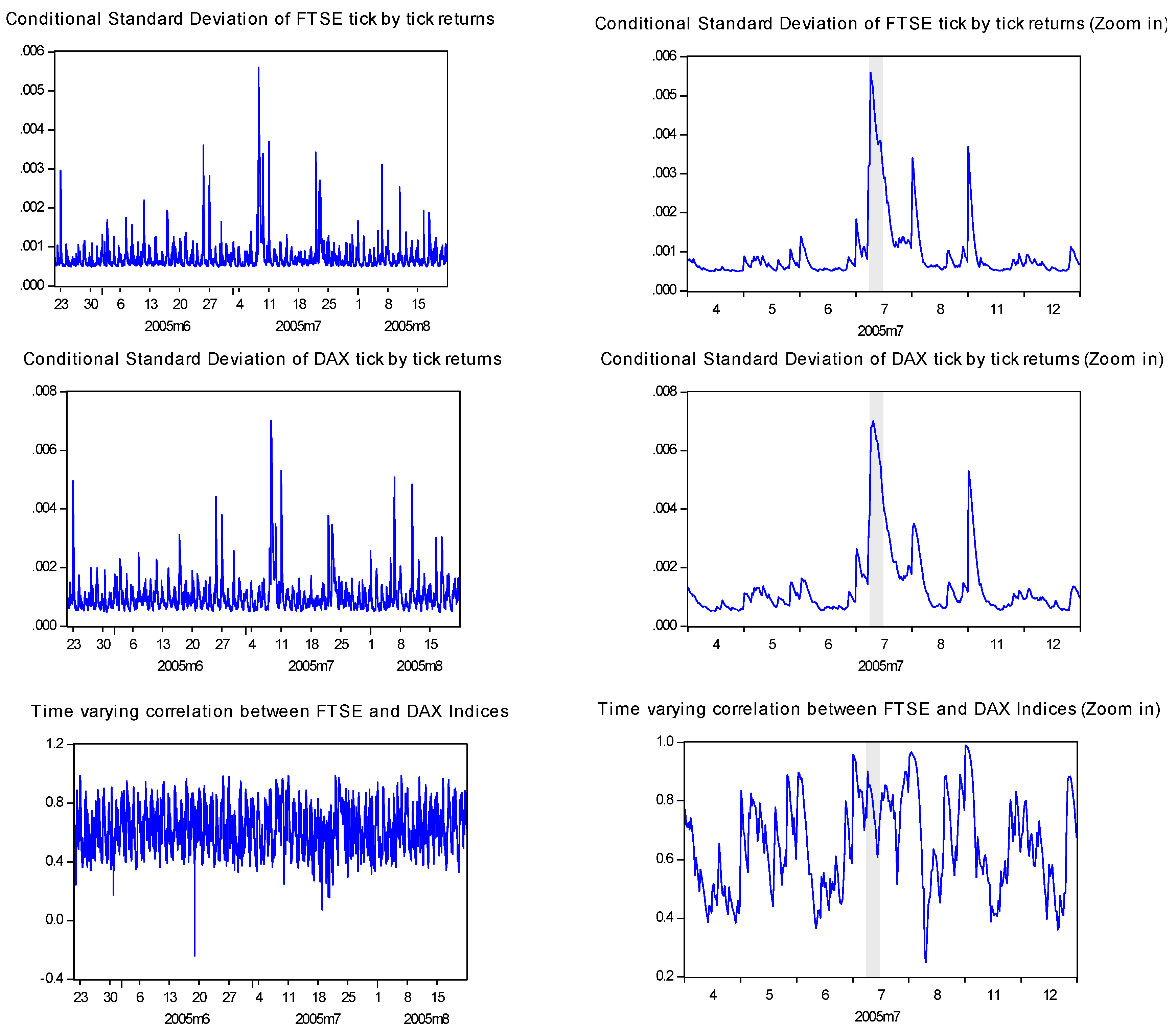 Conditional Volatilities and Correlation for FTSE-DAX intraday stock returns.