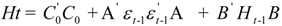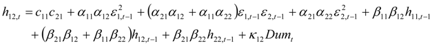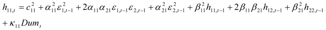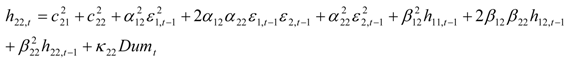 we describe the conditional variance for the first stock index (in our case FTSE-100) at time t – 1, conditional variance for the second stock index (in our case CAC-40 or DAX-30) at time t – 1, and the conditional covariance between the first and the second index in our model.