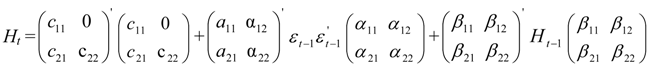 where Equation (1) gives the expression for the conditional mean; Ri,t, and ει, t are the return vector (i = 1 for the FTSE-100 index and 2 for the other two indices for each estimation), and the residual vector respectively; and μi is the mean of this process. In Equation (2) H is the conditional variance-covariance matrix that depends on its past values and on past values of ει, parameter. C0, is a 2 × 2 matrix, the elements of which are zero above the main diagonal; and A, B are matrices. More analytically: