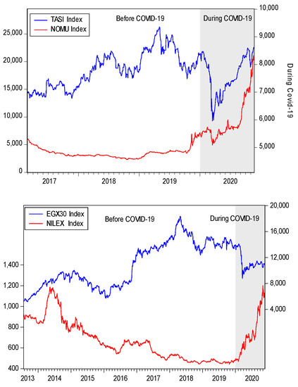 The data set comprises the daily closing prices of the main and SME stock market indices in Saudi Arabia and Egypt. The indices used in this paper are the Tadawul All Share Index (TASI) and SME market index (NOMU) for the Saudi market and the Egyptian Exchange Price Index (EGX 30) and SME market index (NILEX) for Egypt. The daily data for the TASI, NOMU and EGX30 are taken from the Bloomberg database, whereas the NILEX data are pooled from the Egyptian Exchange website. The time span of the study runs from July 2013 to November 2020.6 To account for the COVID-19 pandemic effect, we have divided the sample into the following two subperiods: the period before the COVID-19 pandemic, which covers the period before the emergence of COVID-19, and the COVID-19 pandemic crisis period, which starts with the declaration of the identification of the virus and continues until the end of our sample period.7 Continuously compounded daily returns are calculated on the basis of the following logarithmic filter: , where and represent the percentage daily return and closing index price on day t, respectively.