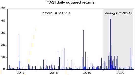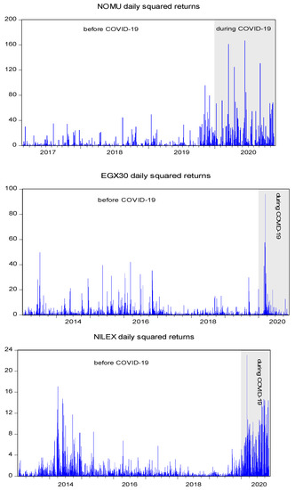 Figure 1 provides a plot of the main versus SME market indices for Saudi Arabia and Egypt. The figure shows evidence of positive co-movement between the main and SME indices in general. The strength of the co-movement, however, varies considerably across markets and subsamples. The NOMU tended to move more closely with the TASI during the pandemic than in the pre-pandemic period. However, the opposite is true for the co-movement between the NILEX and the EGX30, which weakened during the pandemic. The weak co-movement between the two Egyptian indices may be partially driven by the significant capital outflows of more than USD 15 billion that pulled out from the Egyptian market in a flight to safety.8 It is plausible to suggest that the sell-off has perhaps affected the main market index more severely compared to the SME market index. Naturally, SME markets are regulated to attract investors with longer horizons and are less prone to hot money flows. This is in line with the variation in correlation coefficients reported earlier in Table 1. In addition, during the COVID-19 pandemic (represented by the shaded area of the graph), we can see that the SME stock markets for both Saudi Arabia and Egypt enjoyed an upward trend, whereas the main stock markets suffered a massive decline in the same period. The apparent resilience of both SME markets, in the beginning of the pandemic, coincides with the reforms and development programs in the SME markets in Saudi and Egypt. The impact of these reforms is evident by the considerable increase in trading volume between 2019 and 2020 (see Table A1). Indeed, all the indices have rebounded during the later phases of the pandemic thanks to the economic stimulus measures taken by both the Saudi and Egyptian governments, which greatly alleviated the impact of the lockdown. Figure 2 depicts the squared return for the main and SME stock markets. Each series displays several periods of volatility clustering, particularly around the COVID-19 pandemic, with the effect being more pronounced for the SME indices (NILEX and NOMU).