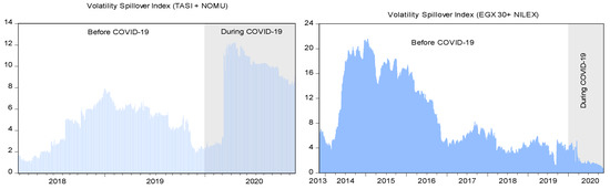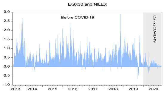 For the long-term volatility spillovers ( and coefficients), the results show the presence of bidirectional volatility spillovers but with different signs for the full period and the pandemic period, whereas significant spillovers are absent for the pre-pandemic period. For the full sample period, the past volatility of the TASI positively affects the current volatility of the NOMU, whereas the past volatility of the NOMU negatively affects the current volatility of the TASI; however, the role of the TASI is much greater than that of the NOMU, which is a qualitatively similar finding to the results obtained using the Diebold and Yılmaz approach. The COVID-19 pandemic period, however, witnessed positive bidirectional volatility spillovers between the two markets. Likewise, the main and SME markets in Egypt exhibit bidirectional volatility spillovers with different signs and in opposite directions; that is, past volatility on the EGX30 negatively affects current volatility on the NILEX, whereas past volatility on the NILEX positively affects current volatility on the EGX30, which implies a calming effect, mainly from the SME market, in the long run. However, no volatility spillovers between the Egyptian markets are detected for the COVID-19 pandemic period, indicating that neither market was affected by the riskiness of the other. These results are inconsistent with those of Nguyen et al. (2020), who fail to find strong evidence for either shock or volatility spillovers between the main and SME markets in any of the countries that they examine. That said, volatility linkages between markets can arise from the following two different sources: (i) common information that affects more than one market concurrently and (ii) informational spillovers attributable to cross-market hedging (Fleming et al. 1998, p. 112). This could reconcile our findings with others in the literature; for example, Karmakar (2010), Koulakiotis et al. (2016) and Kyrkilis et al. (2018) find strong evidence for feedback in conditional variance between portfolios of small stocks and of large stocks in the Indian and Greek markets, respectively.