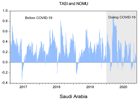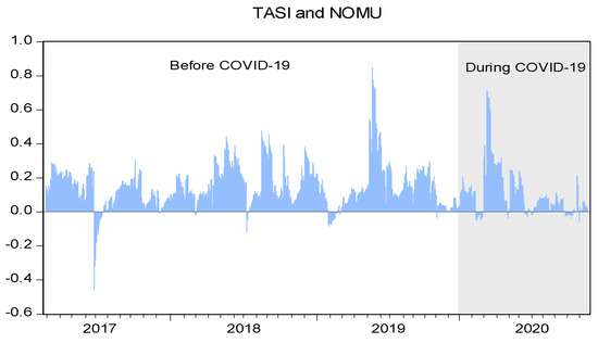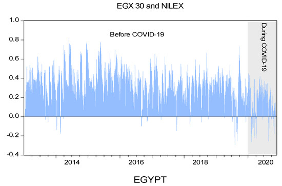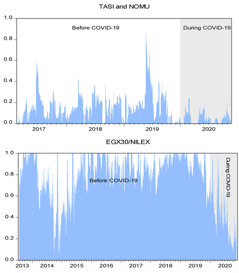 This section reports the empirical results obtained from estimating a bivariate VAR (1)-asymmetric DCC–GARCH (1,1) model for the main–SME stock market pairs in Saudi Arabia and Egypt. In panel C of Table 5, the estimated coefficients for the correlation equation show that , , and are significantly different from zero and vary for the periods both before and during the COVID-19 crisis. The significance of and indicates short- and long-term persistence in the correlation. For each pair of main and SME markets in a country, the dynamic conditional correlation of the pair’s returns exhibits significant reversion, as the sum of and is less than 1, consistent with the findings of Tiwari et al. (2019), Alexakis and Pappas (2018) and Jin et al. (2020). The significance of indicates that positive and negative shocks tend to induce different correlations between stock markets. As shown in panel C of Table 5, is significant and positive for the TASI/NOMU for the full sample period (5.4%). Hence, asymmetry exists in the correlation between the TASI and NOMU markets for the COVID-19 pandemic period (12%). This suggests that the correlation between the main and SME market stocks in Saudi Arabia is greater when markets are falling than when they are rising, in line with the findings of Campbell et al. (2002).17 For Egypt’s main and SME markets, is not significant for the COVID-19 pandemic period, reinforcing the results obtained using the Diebold and Yılmaz approach.